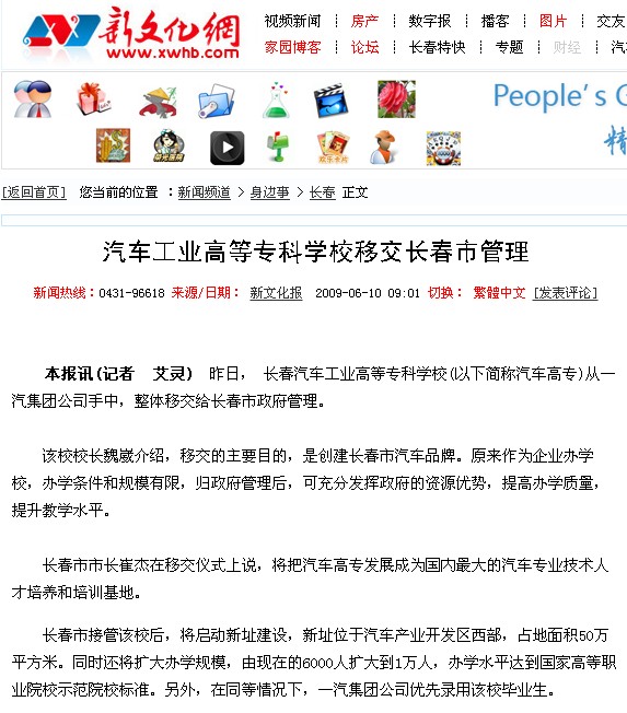 昨日, 长春汽车工业高等专科学校(以下简称汽车高专)从一汽集团公司手中,整体移交给长春市政府管理。