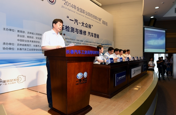 参加开幕式的领导和嘉宾有:教育部行业职业教育教学指导委员会工作办公室副主任王国川;机械职业教育发展中心主任陈晓明;吉林省政协副主席、吉林省教育厅厅长张伯军;吉林省教育厅副厅长苏忠民;长春市委常委、长春市人民政府副市长张晶莹;长春市教育局副局长安军;一汽-大众销售有限责任公司执行副总经理姜立堂;长春汽车工业高等专科学校校长李春明。开幕式由吉林省教育厅副厅长苏忠民主持,长春汽车工业高等专科学校校长李春明、一汽-大众销售有限责任公司执行副总经理姜立堂、机械职业教育发展中心主任陈晓明、长春市委常委长春市人民政府副市长张晶莹在开幕式上先后致辞。吉林省政协副主席、吉林省教育厅厅长张伯军宣布“2014年全国职业院校技能大赛吉林分赛区比赛开幕!” 陈小平同学代表参赛选手宣誓,孟祥文代表裁判员宣誓。三十多位媒体记者对大赛进行了跟踪采访。