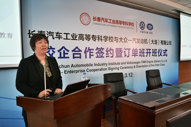 开班仪式是在副校长明晓辉与田洁部长签署校企合作协议后正式开始的。首先,田洁部长以 “强强联手,开启校企合作新篇章——职业教育”为题进行了发言。她介绍了大众一汽发动机(大连)有限公司的发展历程、企业文化及人才培养战略,展示了企业为员工所搭建的宽广的职业发展通道。她强调指出:公司需要一流的技术技能型人才,与汽车高专的强强联手适应了现代化企业的内涵发展需求,这必将结出校企合作的累累硕果。同时,她向订单班的同学们表示祝贺,鼓励他们努力学习,早日成为公司的中坚力量。