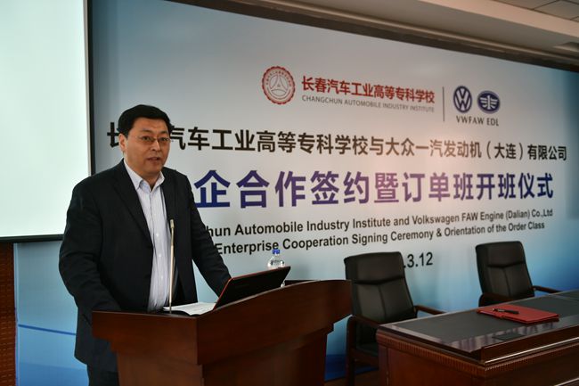 2015年3月12日下午14时,长春汽车工业高等专科学校与大众一汽发动机(大连)有限公司校企合作签约暨订单班开班仪式在培训楼401室隆重举行。大众一汽发动机(大连)有限公司前来参加仪式的有人力资源行政部总监田洁、大众中国人力资源发展和教育战略总监Hans-Peter Faber先生、大众中国各子公司商业伙伴总监陈彤、生产技术部机加成本中心高级经理宋百秋等。我校校长李春明、副校长明晓辉、校长助理胡国良、机械工程学院院长魏建军、招生就业办副主任刘凤珠、教务处副处长陆俊松以及首届订单班的24名同学和各学院师生代表二百多人共同参加了开班仪式。开班仪式由校长助理胡国良主持。