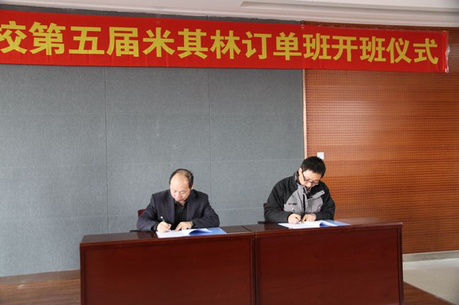 会上米其林千里马项目负责人单洪涛与我校教务处副处长陆俊松共同签署了本届订单班的定向培养协议。2013级米其林订单班班长曲诗涵代表全体学员表示,一定不辜负企业、学校和家长的期望,认真学习专业知识,增强专业技能,用校规校纪和企业的规章制度严格要求自己,养成良好的职业素养,努力成为一名合格的学生和一名优秀的维修人员。
