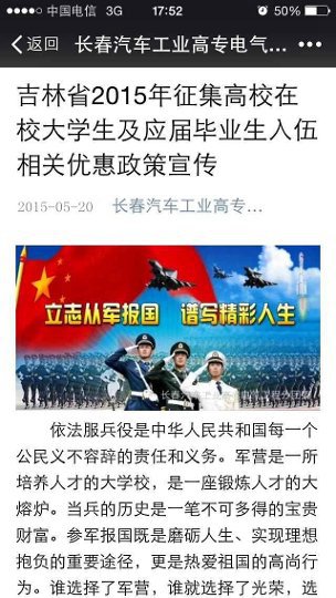 另外,各学院还通过网站、微信公众平台、飞信群、QQ群、宣传板、海报等方式,加大征兵工作宣传力度,营造积极浓厚的参军入伍氛围,激发学生投身国防事业、铸就强军梦的爱国主义情怀。