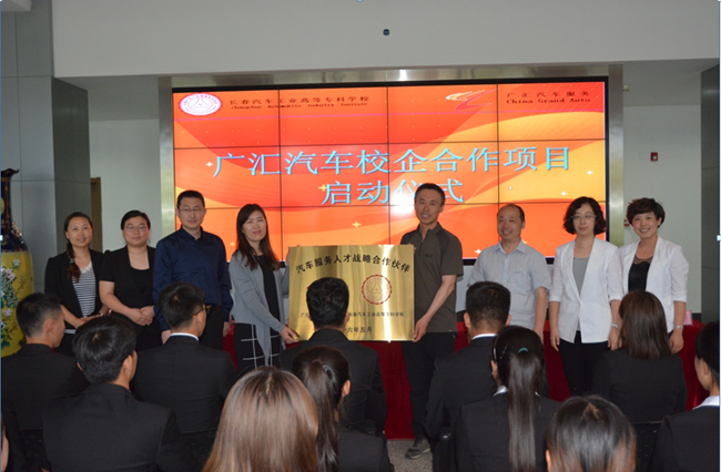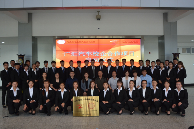 双方发言结束后,校企双方的领导共举“汽车服务人才与战略合作伙伴”的牌子进行剪彩合影,以次记录“广汇订单班”在我校正式成立的历史时刻。