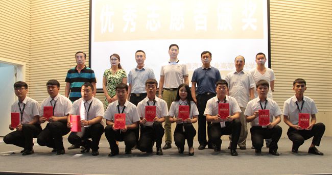 与会领导和荣获“优秀志愿者”称号的志愿者合影