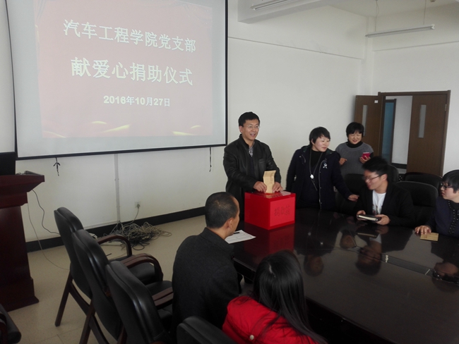 目前,“两学一做”学习教育实践活动如同春风般在我校如火如荼开展。为深入践行“两学一做”学习教育,基础在学、关键在做,学校党委在组织党员干部深入学习党章党规,学习系列讲话,做合格党员的同时,将献爱心活动融入其中,广泛开展向困难学生献爱心活动。校领导带头捐款,将“两学一做”的精神传播到学校的每一个角落,让“两学一做”入人心,这是“两学一做”学习教育活动的具体表现,也凸显了“两学一做”活动的成效。献爱心捐款活动不仅提升了党在人民群众心目中的地位,激励人民群众向党看齐,同时用实际行动教育青年学生坚定理想信念,激发学习热情,树立为祖国建设做贡献和为社会献出自己的一份力量的壮志豪情。 10月27日中午,汽车工程学院党支部在7号楼418会议室举行党员献爱心捐款活动,场面感人。全院共计26名党员踊跃参与捐款,合计捐款金额5500元,捐款将全部用于帮扶学院2016级的两名孤儿学生。 捐款活动现场 党支部书记赵宇同志带头捐款 撰稿:党委宣传部 汽车工程学院 审编:党委宣传部