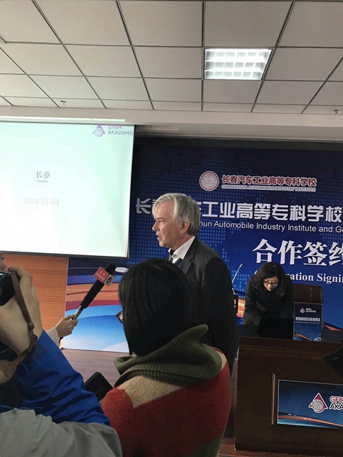 签约仪式后,李春明校长和福格臧主席接受了吉林教育电视台、长春日报、新文化报、一汽电视台、一汽在线等多家媒体记者的集体采访。