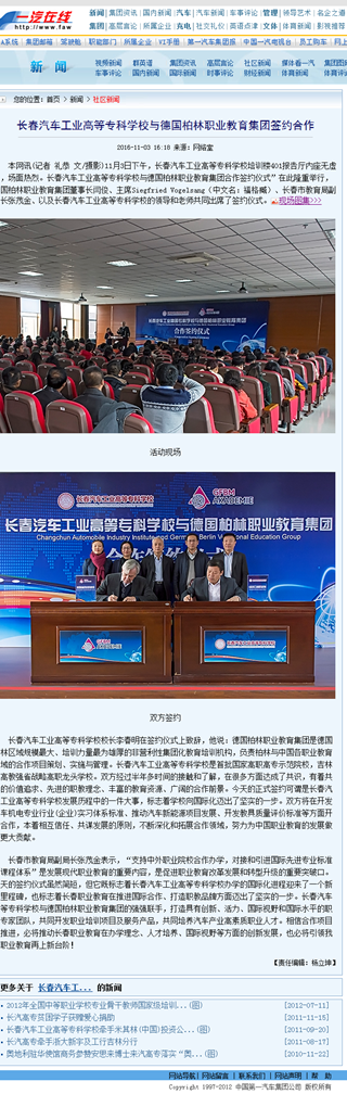长春市教育局副局长张茂金表示,“支持中外职业院校合作办学,对接和引进国际先进专业标准和课程体系”是发展现代职业教育的重要内容,是促进职业教育改革发展和转型升级的重要突破口。今天的签约仪式虽然简短,但它既标志着长春汽车工业高等专科学校办学的国际化进程迎来了一个新的里程碑,也标志着长春职业教育在推进国际合作、打造职教品牌方面迈出了坚实的一步。长春汽车高等专科学校与德国柏林职业教育集团的强强联手,打造具有创新、活力、国际视野和国际水平的职教专家团队,共同开发职业培训项目及服务产品,共同培养汽车产业高素质职业人才。相信合作项目的推进,必将推动长春职业教育在办学理念、人才培养、国际视野等方面的创新发展,也必将引领我省职业教育再上新台阶!
