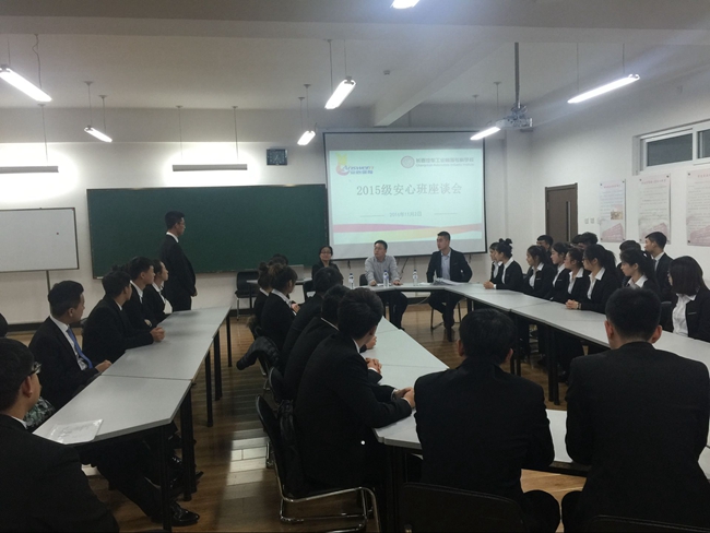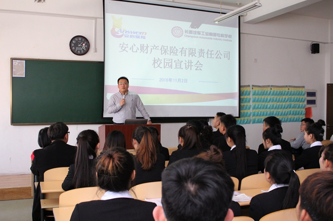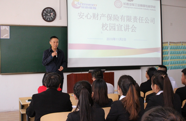 简短的宣讲会上,学校就业创业中心刘凤珠主任致欢迎词,她对安心公司领导莅临学校表示热烈的欢迎,同时介绍了我校的发展历程、作为国家首批示范高职院校依托行业企业联合办学和开展特色式订单培养项目特色等情况。
