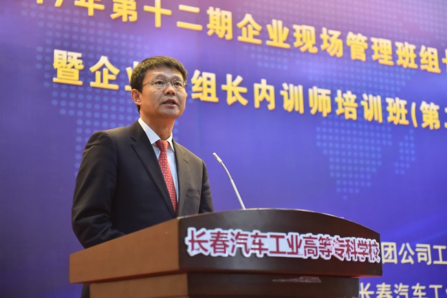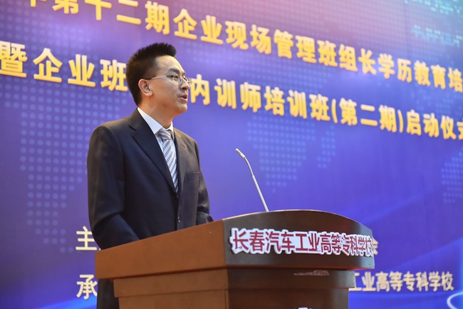 我校党委书记安军首先致辞,安书记在致辞中谈到,作为我校继续教育品牌项目,自2006年至今已经为一汽集团培养了2000多名生产一线班组长,涌现出王洪军、李凯军、齐嵩宇、周世君等一大批优秀毕业生,并在此基础上选拨优秀毕业生作为内训师学员开展培训,使他们的职业技能得到传承。安书记强调,深化校企合作是提升职教培养能力、推动企业发展的“金钥匙”,我校将力争打造成为企业培养精英人才、传承企业文化的重要基地,努力构建人才成长“立交桥”,让每个高专学子都有人生出彩的机会。