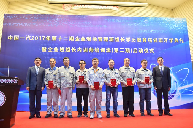 6月2日,中国一汽2017年第十二期企业现场管理专业班组长学历教育培训班开学典礼暨企业班组长内训师培训班第二期启动仪式在我校图书馆多功能报告厅隆重举行。中国第一汽车集团公司党委副书记、副总经理秦焕明,一汽集团工会常务副主席孙捷,吉林省教育考试院副院长熊越、自学学历教育考试部部长郭靖山,吉林大学商学院副院长梁志平,我校党委书记安军、校长李春明、副校长胡国良等领导出席典礼。典礼仪式由一汽集团公司工会经济技术部部长姬小明主持,来自一汽16个分子公司工会工作人员,2017年企业现场管理本专科工会班新生、第一期企业班组长内训师培训班结业学员及第二期培训班新学员共计267人参加了本次典礼。一汽集团报社、一汽电视台、吉林省教育电视台等多家媒体对本次典礼进行了现场采访。