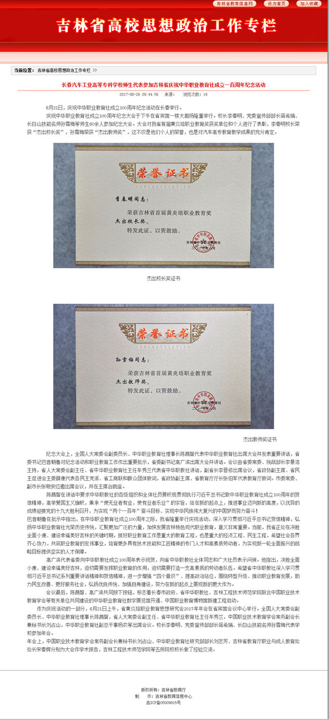 吉林省高校思想政治专栏——长春汽车工业高等专科学校师生代表参加吉林省庆祝中华职业教育社成立一百周年纪念活动