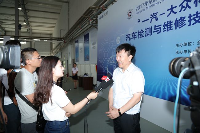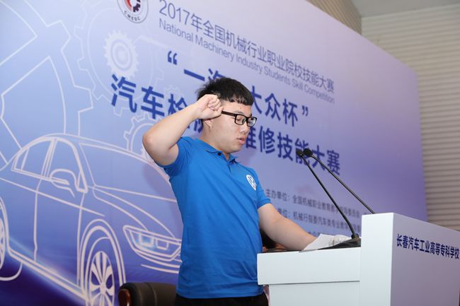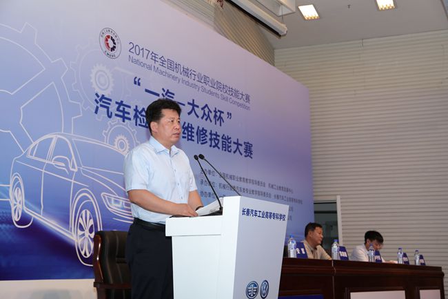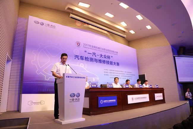 2017年7月17日上午9:00,2017年全国机械行业职业院校技能大赛汽车类专业技能大赛开赛式在长春汽车工业高等专科学校图书馆报告厅隆重举行。长春市教育局副局长张茂金主持开赛式。全国机械职业教育教学指导委员会主任委员、机械工业教育发展中心主任陈晓明,吉林省教育厅职业与成人教育处副处长申守权,一汽-大众销售有限责任公司党委副书记、纪委书记、工会主席曹伟华,长春汽车工业高等专科学校党委书记安军、长春汽车工业高等专科学校校长李春明在主席台上就坐。机械工业教育发展中心职业教育处副处长吕冬明,一汽-大众销售有限责任公司大众品牌售后服务部、服务技术培训部中方部长周文波和德方部长沃尔特•约克,长春汽车工业高等专科学校副校长明晓辉、副校长胡国良、副校长丁卓等领导和嘉宾与来自全国21个省市、自治区、直辖市的158支代表队的领队、指导教师及行业专家、赛事裁判员,行业企业代表共同参加开赛式。40多位媒体记者见证了这一重要时刻。