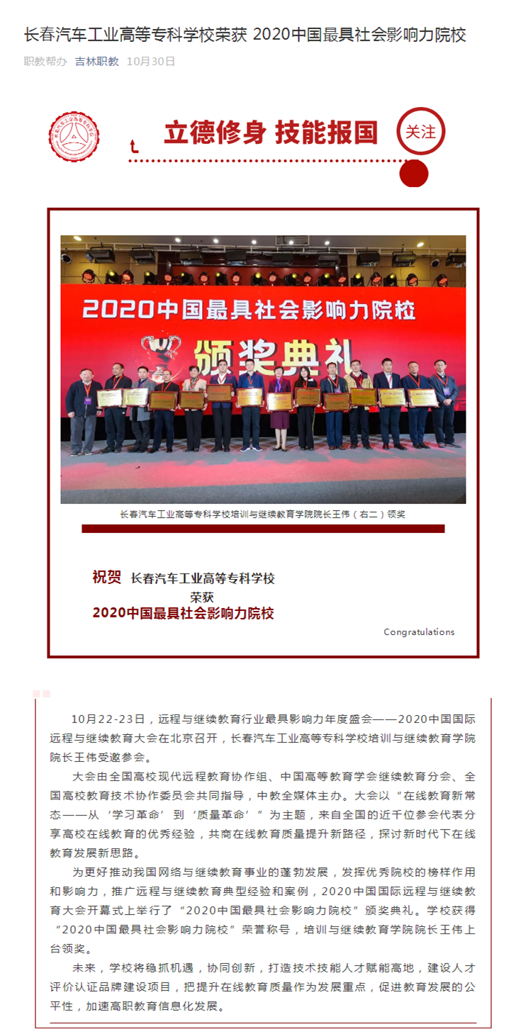 吉林职教——长春汽车工业高等专科学校荣获2020中国最具社会影响力院校