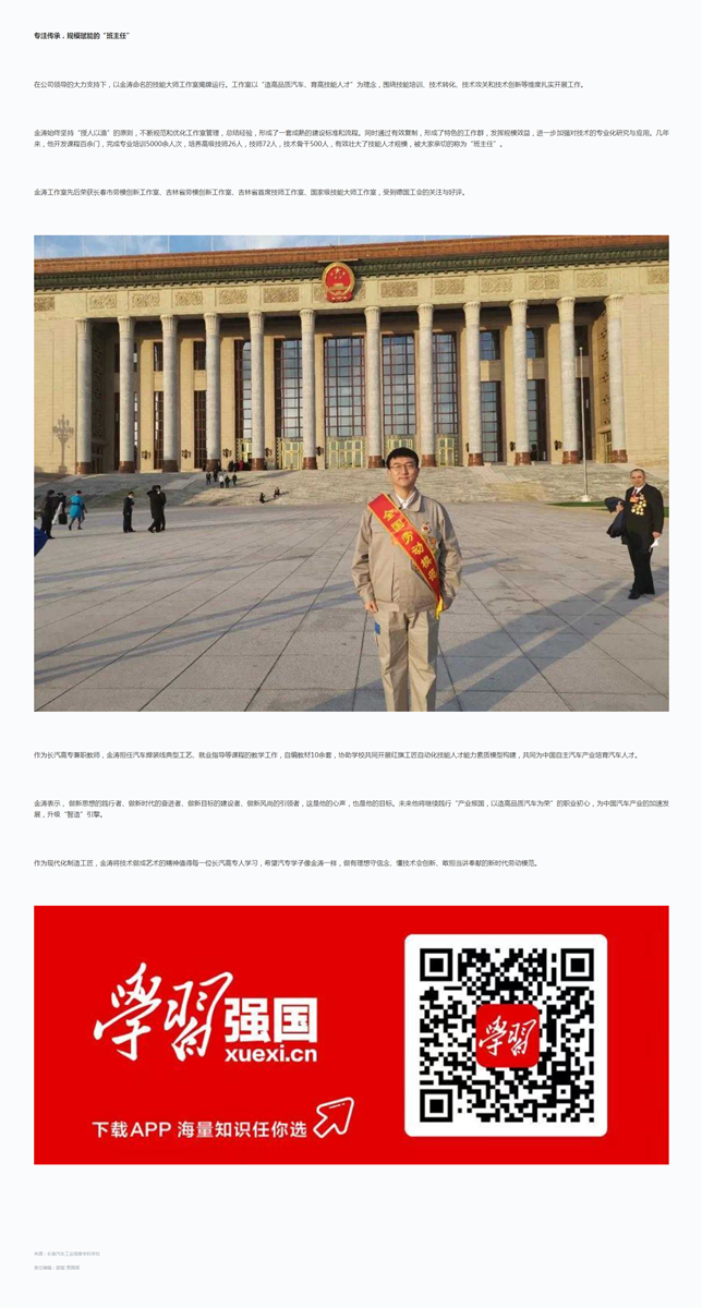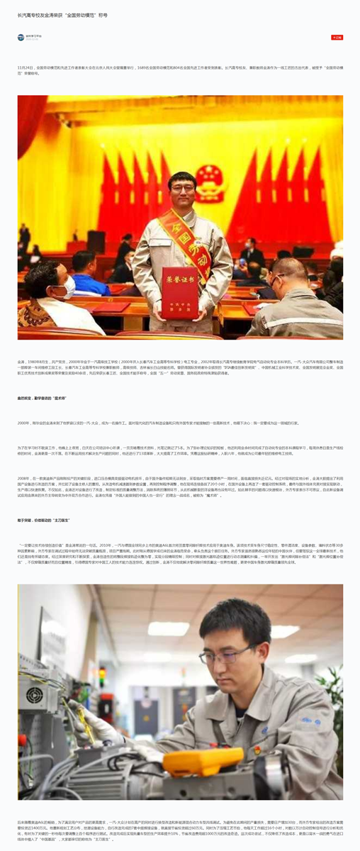 学习强国——长汽高专校友金涛荣获“全国劳动模范”称号