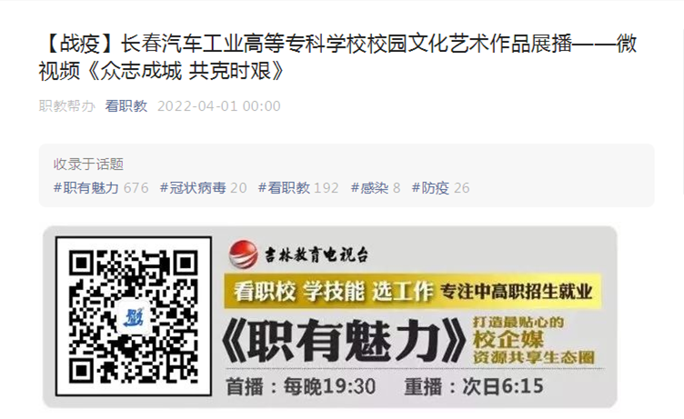 看职教——长春汽车工业高等专科学校校园文化艺术作品展播——微视频《众志成城 共克时艰》