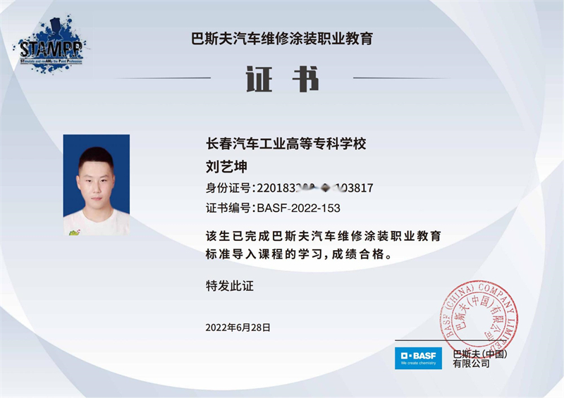 我校汽车运用学院19级巴斯夫订单班刘艺坤等18名同学顺利完成巴斯夫汽车维修涂装职业教育标准导入课程的学习,在前期厂家组织的全国毕业考试中全部通过线上理论考核,获得了巴斯夫证书。