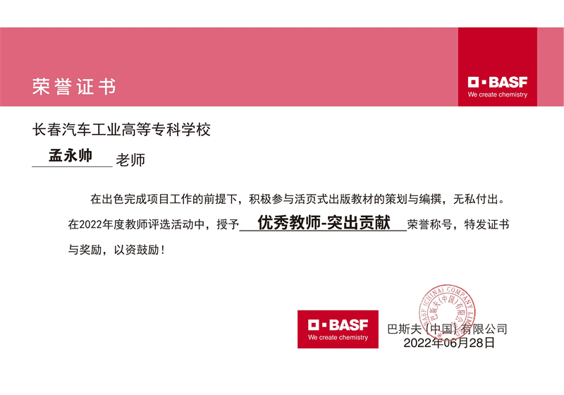 我校汽车运用学院巴斯夫校企合作教师孟永帅、王阔分别荣获“优秀教师-突出贡献”、“优秀教师”荣誉称号。