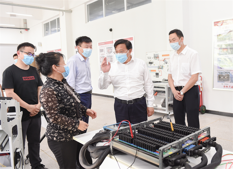 韩俊在参观新能源汽车技术实训区、智能制造协同创新中心,详细了解新能源汽车技术创新等情况后,对我校为汽车工业培养人才的办学定位充分肯定。他强调,要加快启动职业本科建设,加快打造精品专业,完善“岗课赛证”等方式,不断提升教育质量。围绕汽车生产、销售等全产业链开展办学,瞄准新能源汽车、氢能燃料电池等新技术、新产业、新赛道,与一汽加强合作,实施好红旗工匠培育工程,加大研究投入、跟上技术前沿,共建人才培养标准体系,为重点企业培养更多专业过硬的工匠。