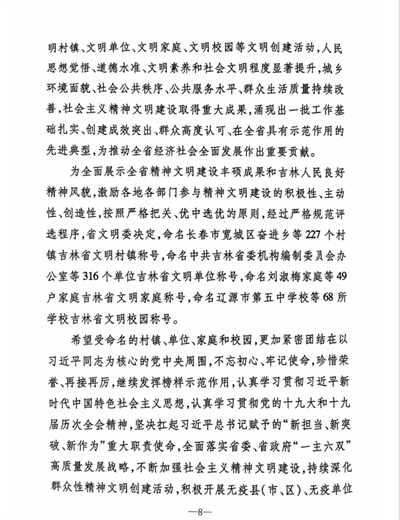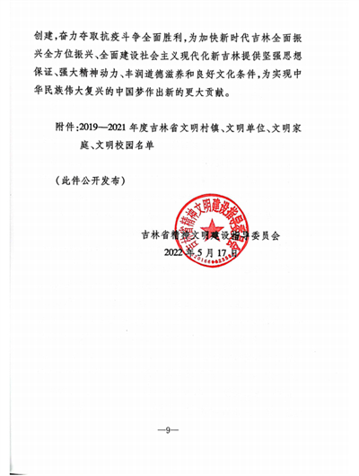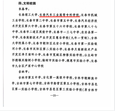 近日,吉林省精神文明建设指导委员会印发《吉林省文明委关于命名2019-2021年度吉林省文明村镇、文明单位、文明家庭、文明校园的决定》,全省共有68所学校入选,我校位列其中,荣获2019-2021年度吉林省“文明校园”荣誉称号。