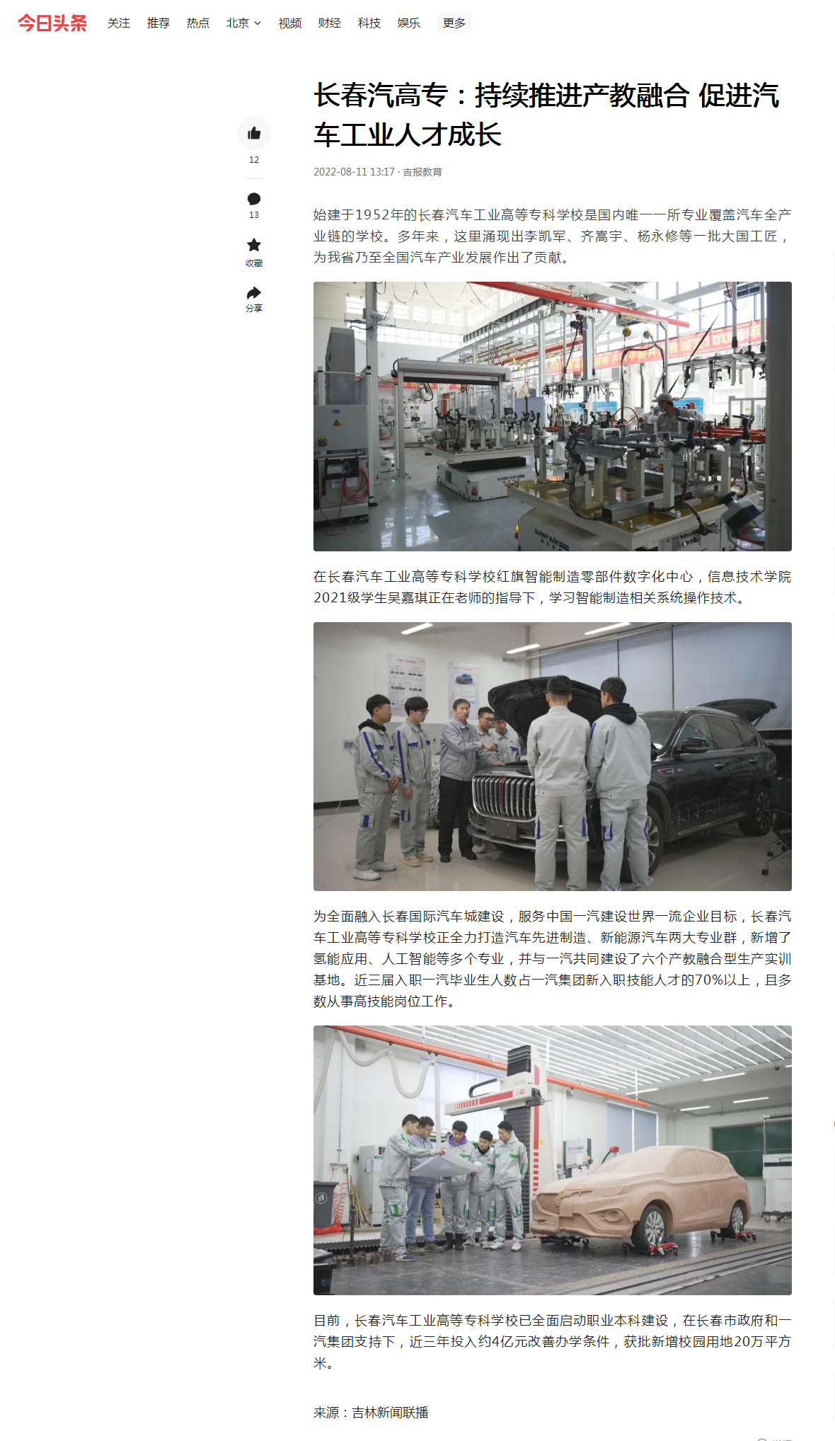 今日头条——长春汽高专:持续推进产教融合 促进汽车工业人才成长