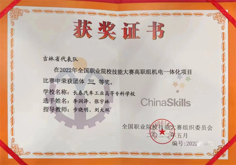 8月25日至28日,2022年全国职业院校技能大赛“机电一体化项目”赛项在浙江机电职业技术学院举行,共有来自全国29个省、直辖市、自治区和新疆生产建设兵团的55支队伍参加。我校电气工程学院李润泽、张宇林两名同学(指导教师步晓明、刘大双)代表吉林省参赛,荣获高职组三等奖。