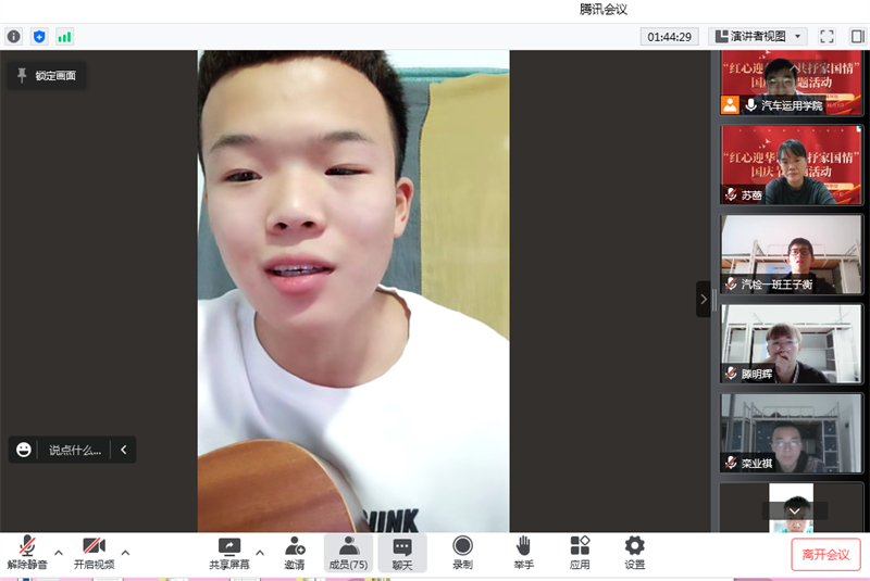 活动中,同学们通过独唱、合唱、吉他弹唱等方式告白祖国,《我和我的祖国》、《我爱你中国》、《信仰》等曲目回荡在会议直播间,大家激扬澎湃讴歌伟大祖国,共同祝福伟大祖国73岁生日快乐。