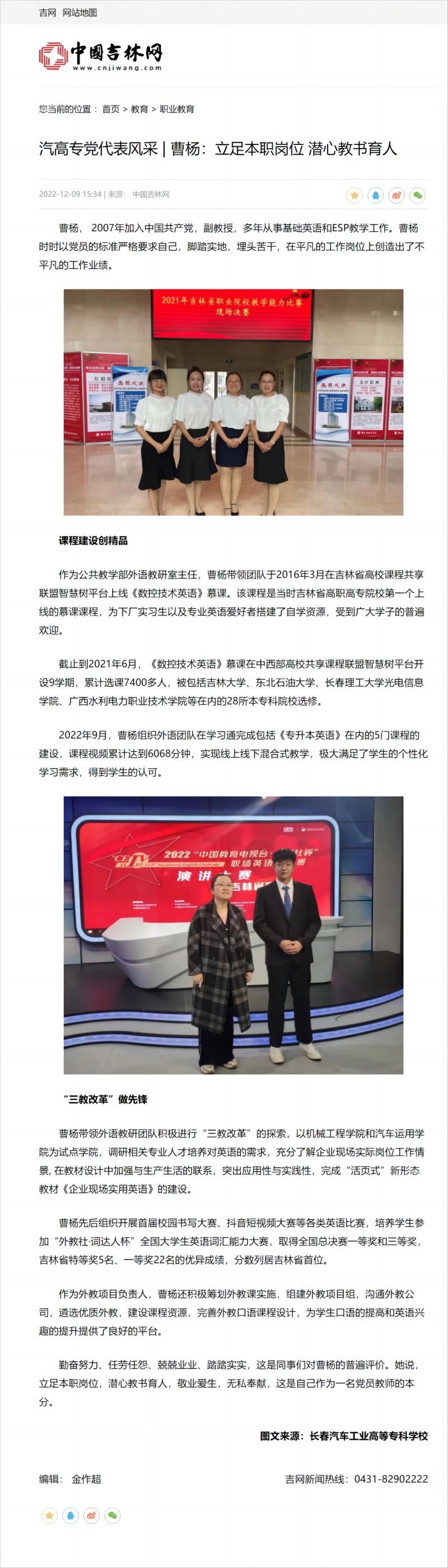 中国吉林网——汽高专党代表风采 | 曹杨:立足本职岗位 潜心教书育人