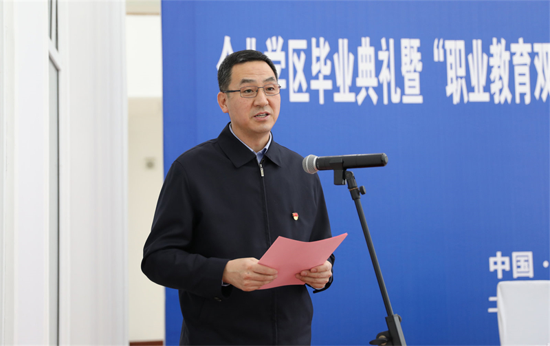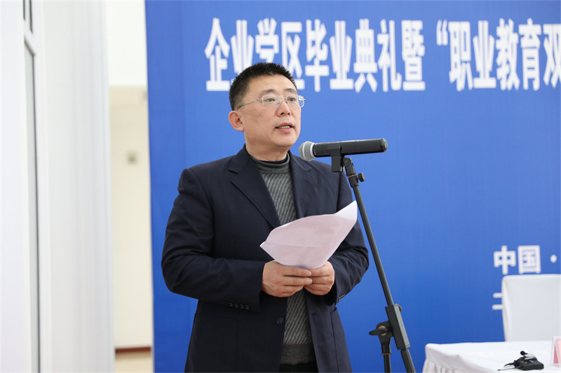 安军在致辞中对首届高职扩招学生顺利毕业表示祝贺,表达了对同学们未来发展的殷切祝福和对今后校企双方深入合作的期盼与信心。