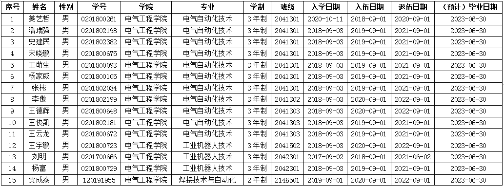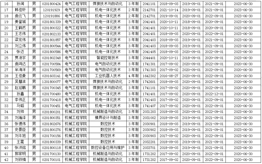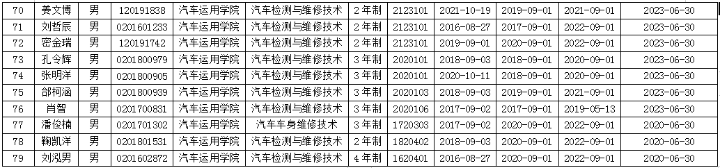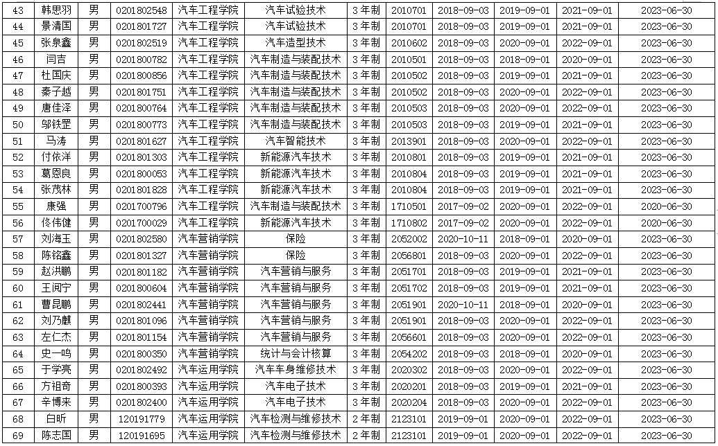 根据《关于做好2023年吉林省普通高等学校专升本教育工作的通知》(吉教学〔2023〕2号)要求,经个人申请、学院初审、学生处(团委)复审,现将通过2023年免试专升本校级审核的学生名单予以公示。 公示期间,对公示对象有异议者,可向学生处(团委)实名反映,匿名举报不予受理。反映的情况和问题必须实事求是,我们将对反映的情况和问题进行认真调查核实,并按有关规定做出相应处理。凡反映问题不实,干扰免试专升本工作的将严肃处理。 公示时间:2023年3月2日至2023年3月9日 联系电话:0431-85751897 联系人:张老师 特此公示。 长春汽车工业高等专科学校 学生处(团委) 2023年3月2日