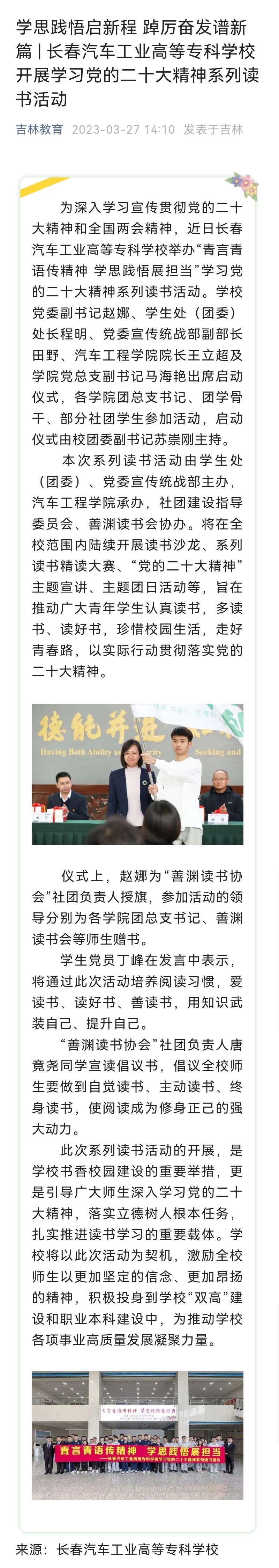 吉林教育——学思践悟启新程 踔厉奋发谱新篇 | 长春汽车工业高等专科学校开展学习党的二十大精神系列读书活动