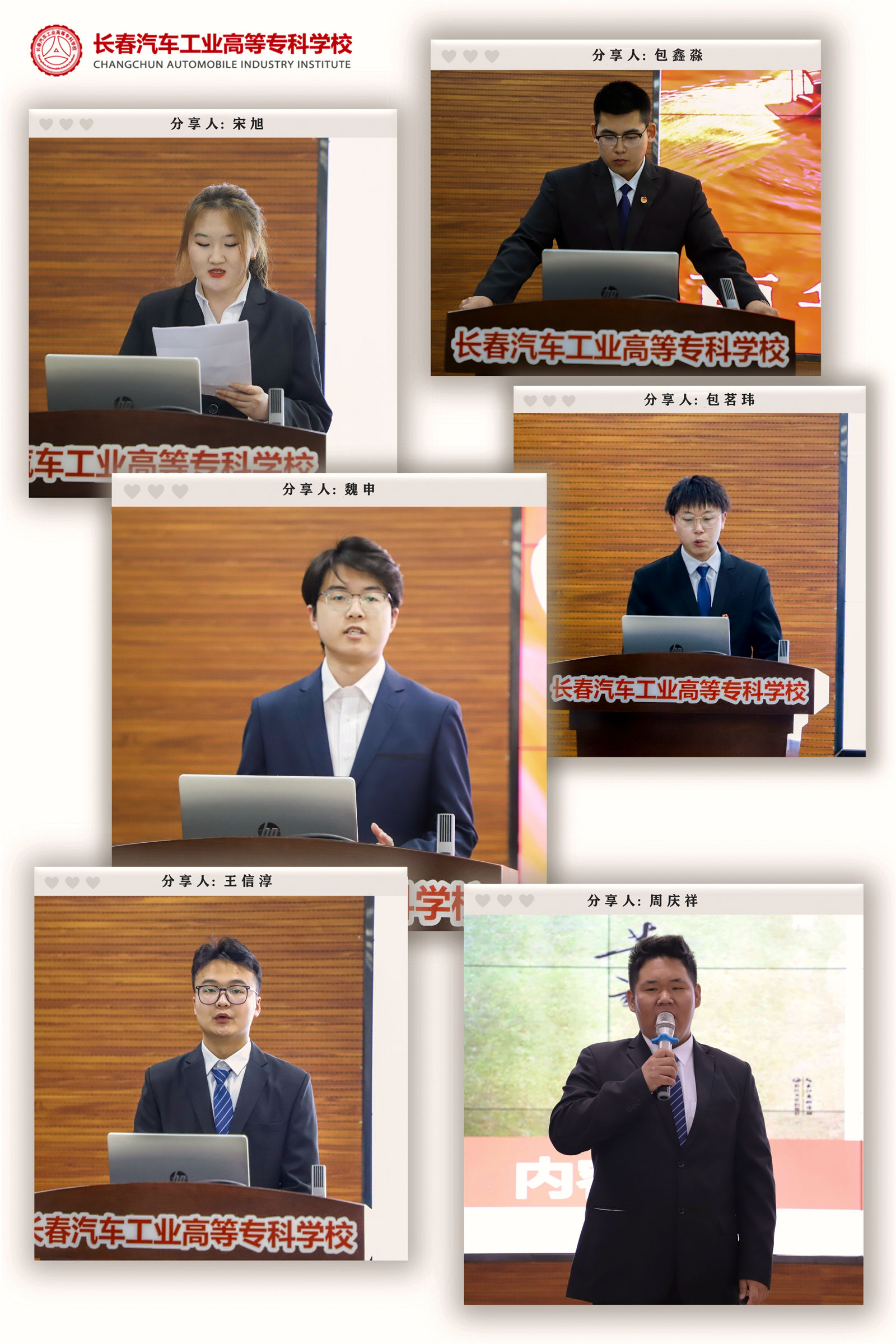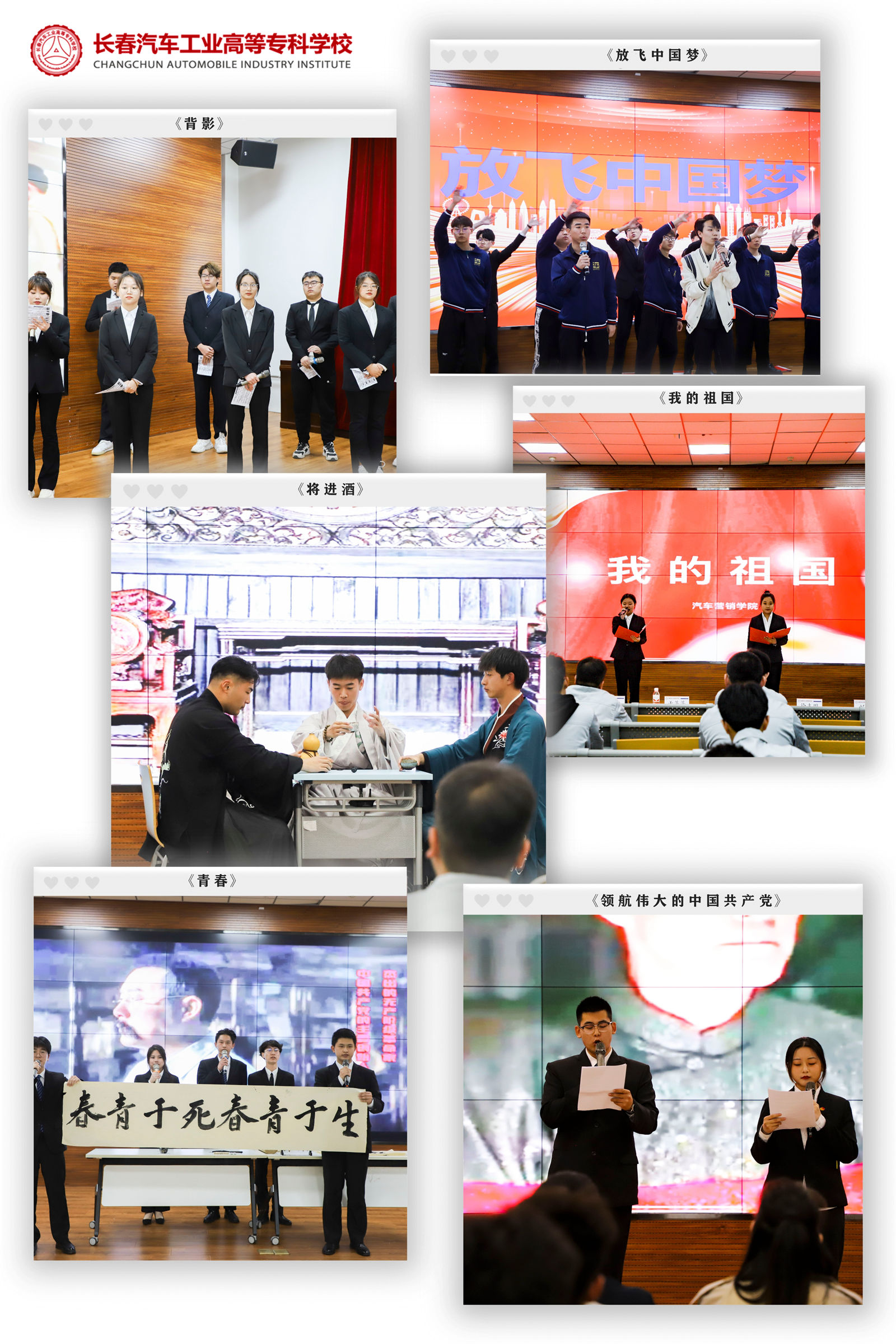 同学们满怀激情走上讲台,结合自身阅读的书籍畅谈所学、所思、所得,传递书香正能量。每位同学做完图书分享后,都衔接了各学院的节目表演,分享会现场气氛热烈。机械工程学院的诗朗诵《领航——伟大的中国共产党》,展现了国家从开天辟地到改天换地的峥嵘历程;汽车运用学院的舞台剧《青春》,告诉观众虽然每个人的青春不尽相同,但有志向的人永远自信自强;信息技术学院的故事剧《背影》用深刻细腻的文字展现出了父亲对儿子的爱;汽车工程学院的舞台剧《将进酒》,巧妙还原了当年狂放不羁的李太白造就的诗意中国;汽车营销学院的诗朗诵《我的祖国》点明了要把国家荣誉做为自己毕生的信仰;电气工程学院的诗朗诵《放飞中国梦》,阐释了“中国梦”的伟大。