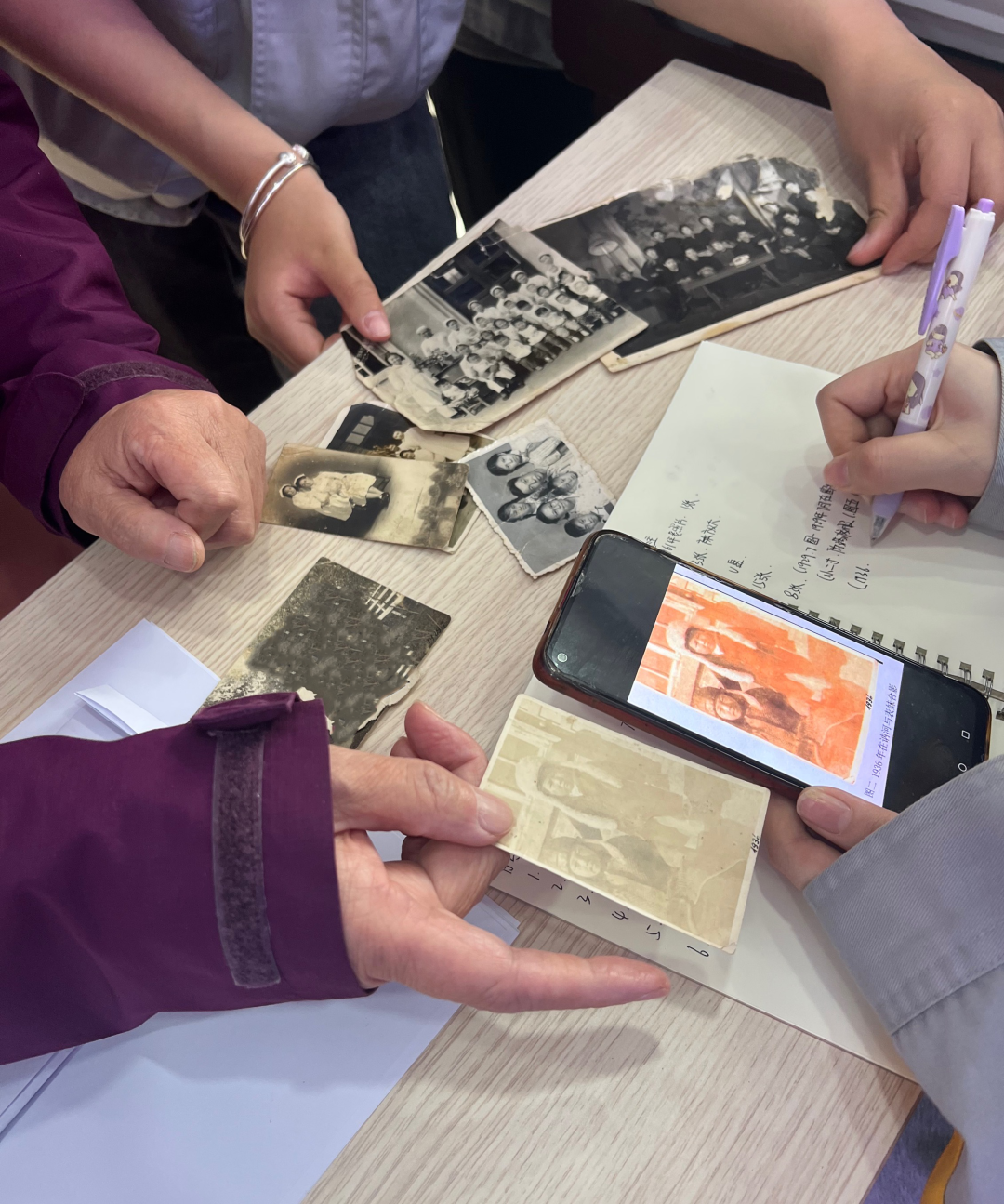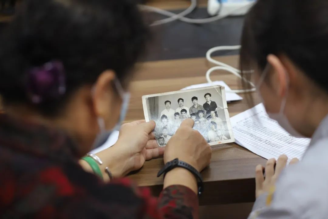 在锦城街道办事处的活动现场,师生们看到了1956年第一汽车制造厂的开工典礼现场及当时居民与我国第一辆解放牌汽车合影的珍贵影像,还有1950年国庆节当天在长春市文化广场庆典的照片等,这些照片记录了社会的发展历程、百姓的生活变迁、城市的风貌更新,是历史的缩影和见证。社区居民拿着自家珍藏的老照片与学生们讲述着关于他们的“照片故事”。