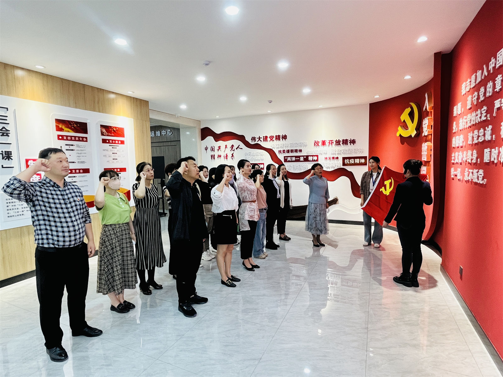 在党员组织生活馆,全体党员教师一同回顾了我党发展的光辉历程,深刻领会中国共产党人精神谱系的丰富内涵,并重温入党誓词,集体庄严宣誓。