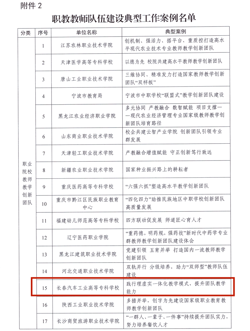 近日,教育部教师工作司发布《关于公布职业教育教师队伍建设典型工作案例的通知》,我校报送的工作案例《践行理虚实一体化教学模式,提升团队教学能力》成功入选。