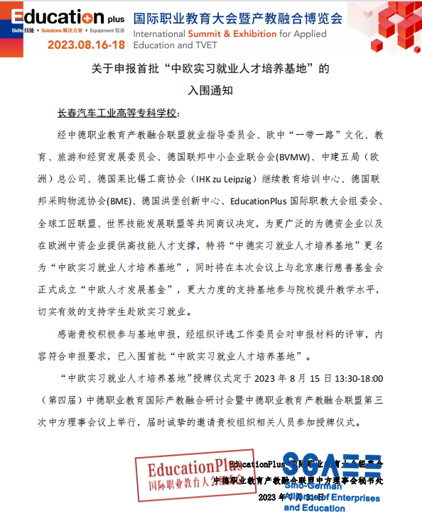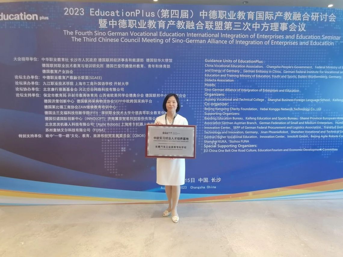 8月15日,2023 EducationPlus(第四届)中德职业教育国际产教融合研讨会暨中德职业教育产教融合联盟第三次中方理事会议在长沙举行。会上,我校被中德职业教育产教融合联盟就业指导委员会授予首批“中欧实习就业人才培养基地”,我校国际交流学院院长刘凤珠代表学校接受表彰。