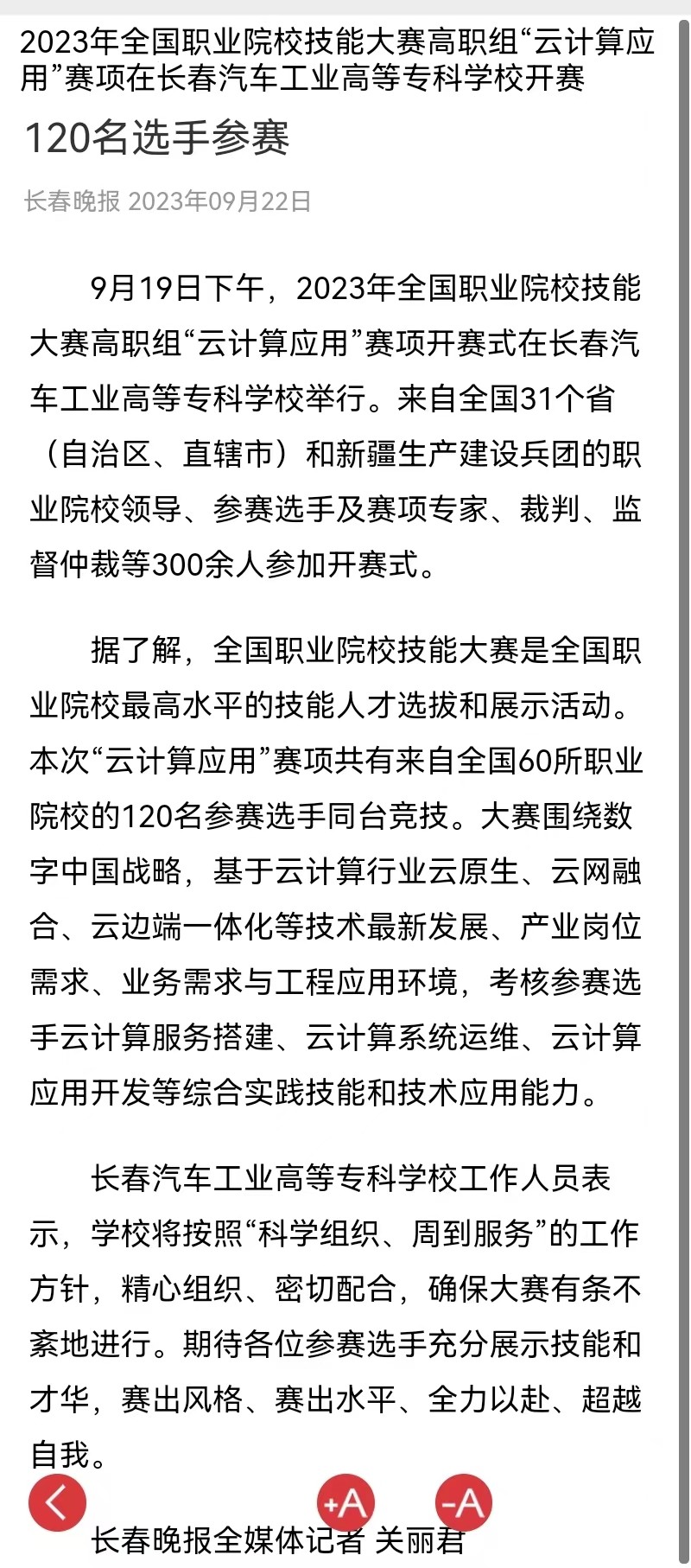 长春晚报——2023年全国职业院校技能大赛高职组“云计算应用”赛项在长春汽车工业高等专科学校开赛