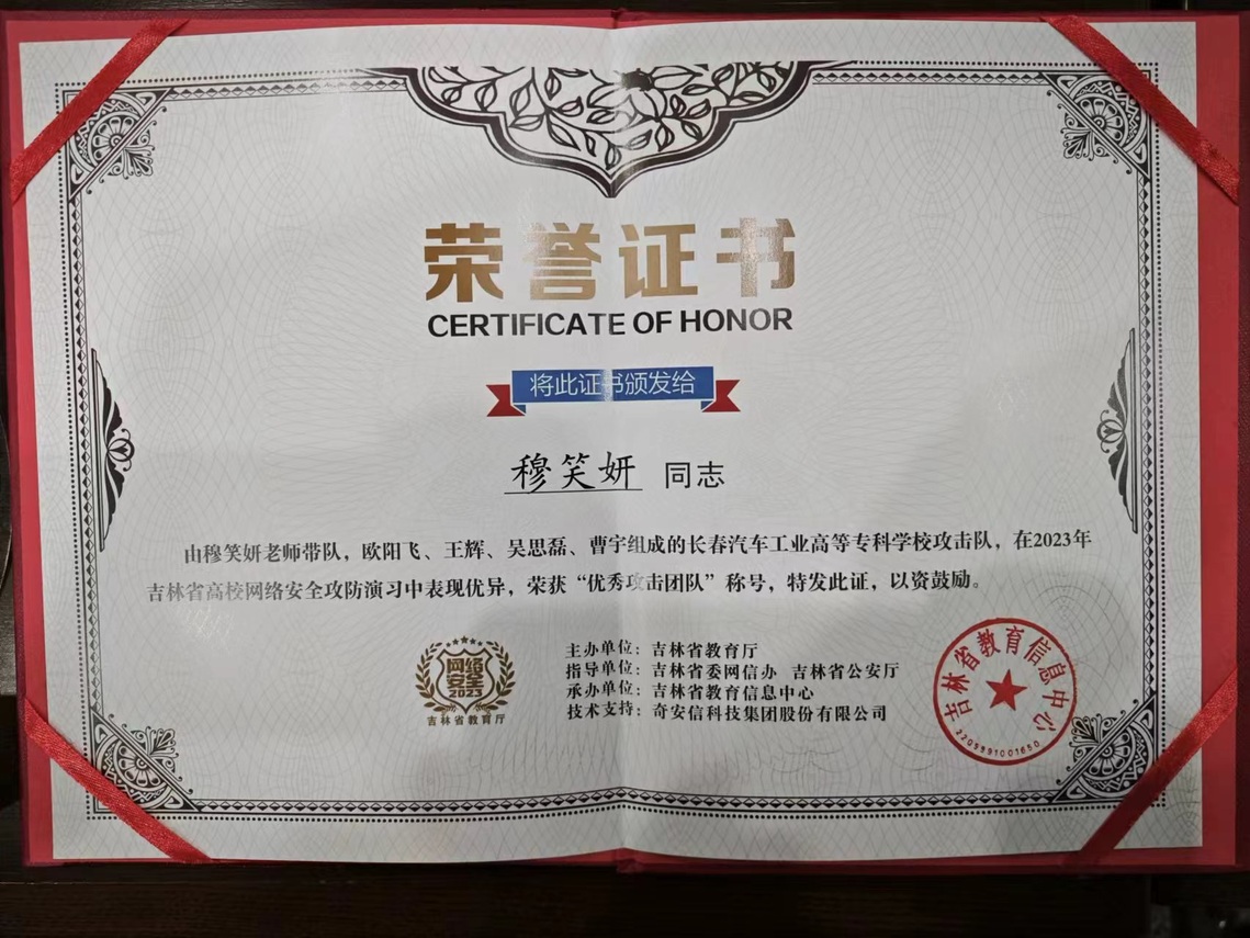 9月18日至9月22日,吉林省教育厅组织开展2023年高校网络安全攻防演习活动。在演习活动中,我校积极组织网络攻击队伍,主动防御,攻防对战,达到信息资产零失陷的目标。由我校信息技术学院穆笑妍、欧阳飞、王辉、吴思磊、曹宇五名教师共同组成的网络攻击团队获得“优秀攻击团队”荣誉称号。吉林省教育厅对我校在2023年高校网络安全攻防演习中的出色表现给予了高度肯定和赞扬。