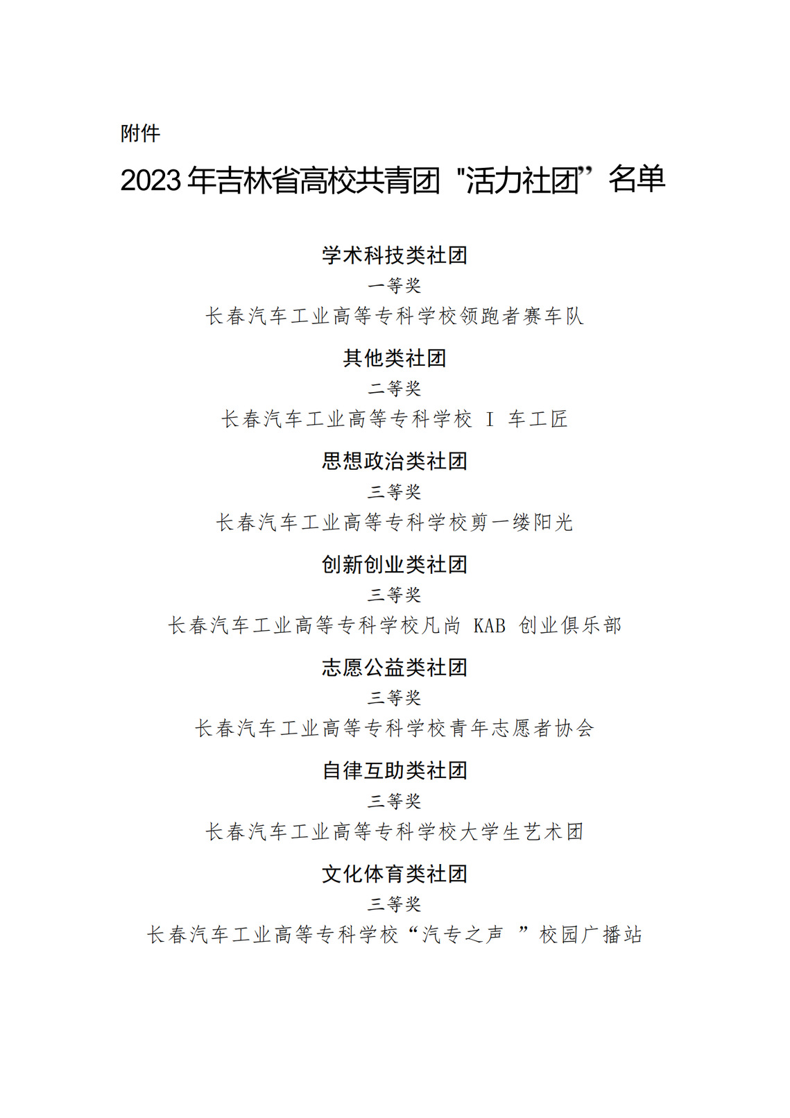 近日,2023年度吉林省高校共青团“活力社团”获奖名单揭晓,我校领跑者赛车队社团荣获吉林省一等奖,Ⅰ车工匠社团荣获吉林省二等奖,大学生艺术团、“汽专之声”校园广播站、青年志愿者协会、凡尚KAB创业俱乐部、剪一缕阳光等5个社团荣获吉林省三等奖。