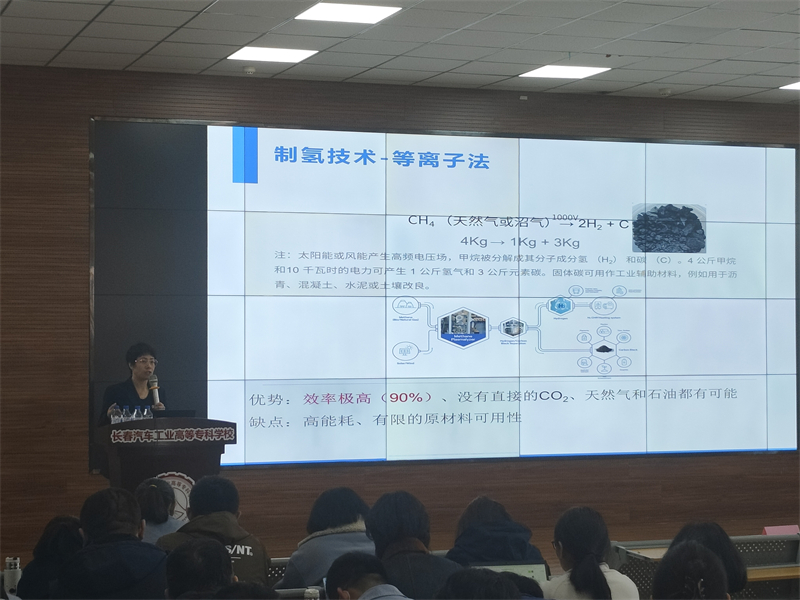 汽车工程学院教师侯丽春介绍了目前氢能源发展的现状、氢燃料电池技术的应用方法和原理,以及氢燃料电池在汽车制造领域的应用。