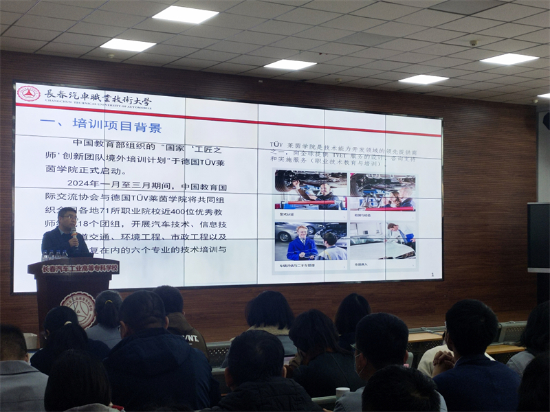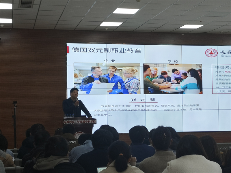 汽车工程学院副院长李文博介绍了本次赴德国培训的背景、德国职业教育相关的法律法规、培训框架以及德国双重职业培训、双轨制教学的特色。