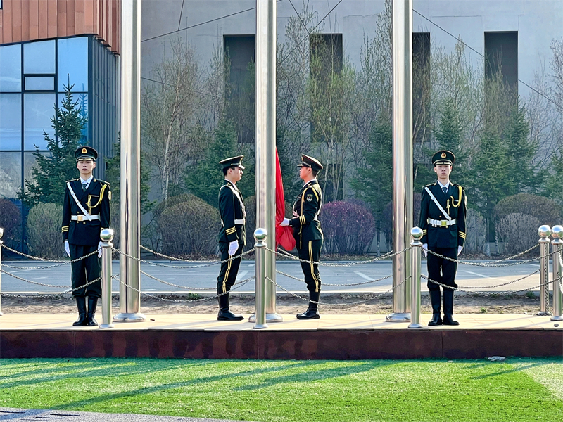 早上7时,在庄严肃穆的气氛中,伴随着激昂雄壮的《义勇军进行曲》,五星红旗冉冉升起。观礼师生全体肃立,向国旗行注目礼。