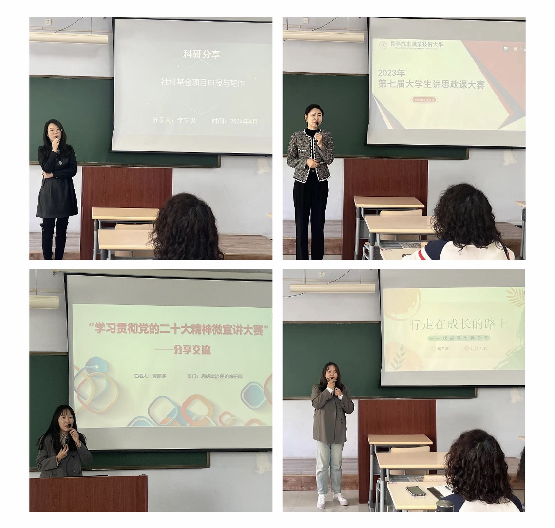 为落实思政课立德树人根本任务,推动我校职业本科教学工作走深走实,进一步提高思政课教师的教学、竞赛、授课能力,近日,思想政治理论教研部组织开展“以研促教 以赛促改 以评促建”课程建设经验交流分享会。