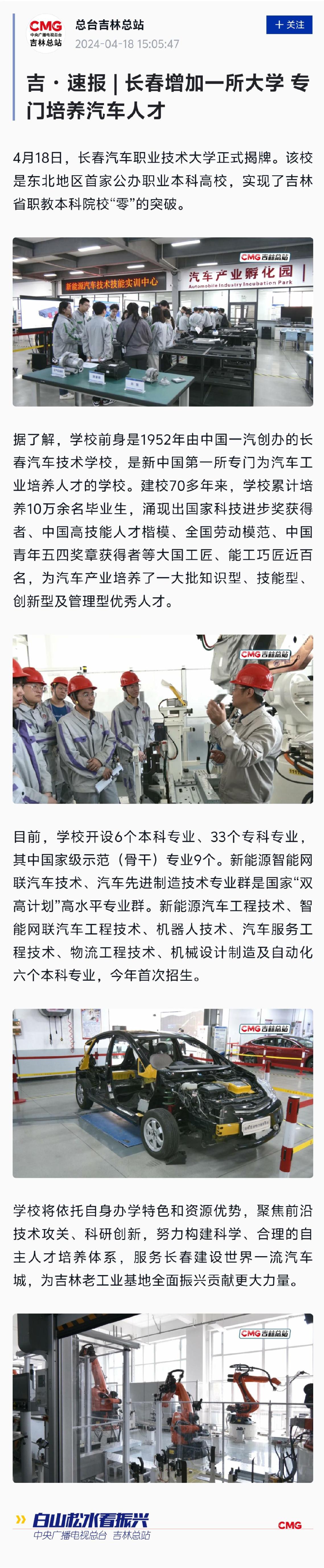 中央广播电视总台——吉 · 速报 | 长春增加一所大学 专门培养汽车人才