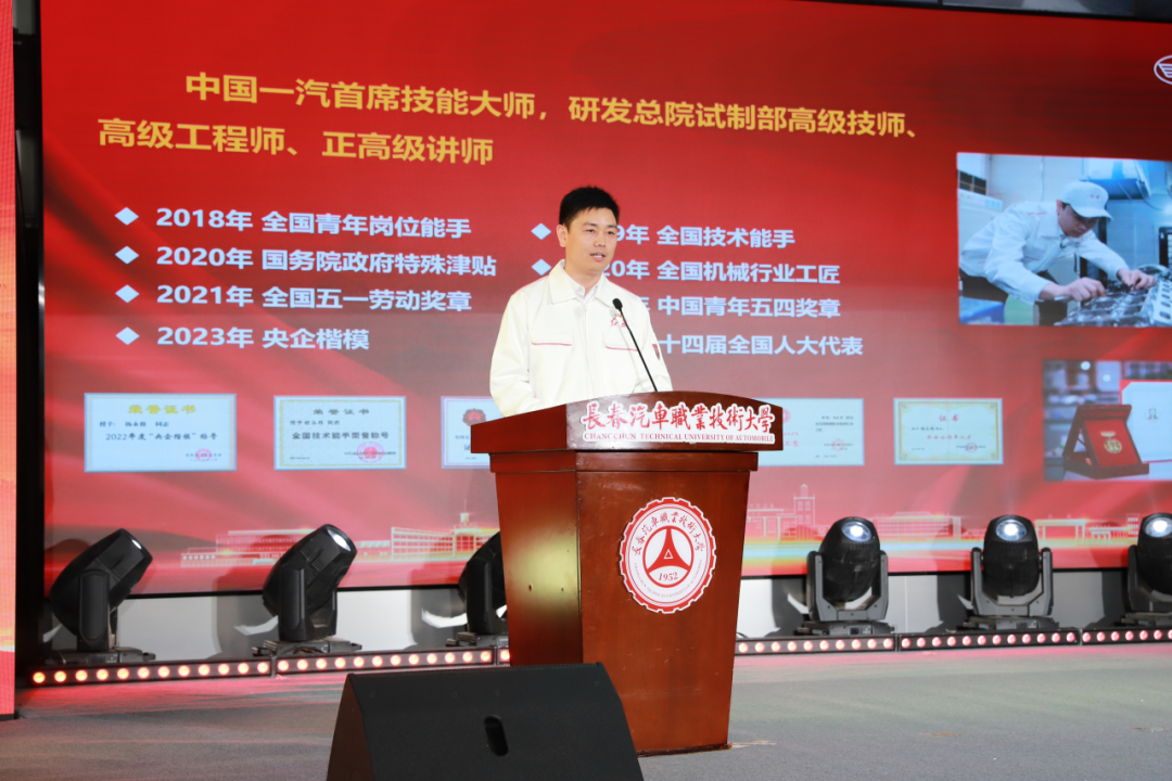 “全国技术能手称号”获得者、中国第一汽车股份有限公司红旗制造中心装备维修段长赵达分享了将个人“造车”梦想融入振兴民族汽车工业、服务汽车强国建设的追梦之路,他在汽车制造一线练就过硬专业技能,解决6项行业难题,节创价值1300余万元,获评12项国家级荣誉。