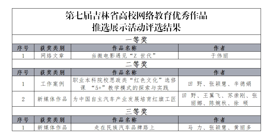 近期,由吉林省教育厅举办的第七届吉林省大学生网络文化节和全省高校网络教育优秀作品推选展示活动评选结果揭晓。活动开展以来,高校师生积极响应,累计收到全省高校报送作品1090件。经作品申报、资格审核、专家评审等环节,共有2大类13个赛道539件作品获评省级奖项。我校精心组织参与、积极报送,在本次活动中共计13件作品获奖,其中省级一等奖4项、二等奖4项、三等奖5项。