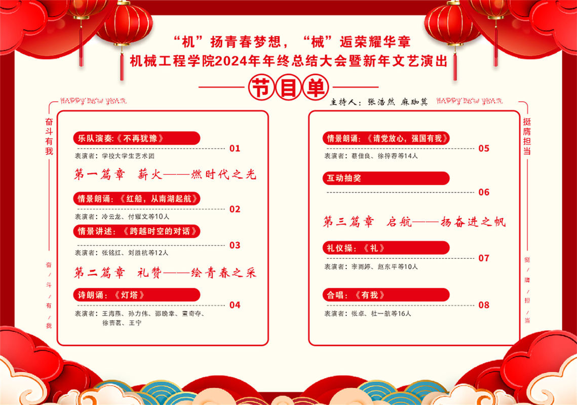 12月26日,机械工程学院在学校红旗汽车品牌服务中心举办2024年年终总结大会暨新年文艺演出。学校副校长张勇忠、财务与资产管理处处长杨大志、保卫处处长李明东、招生就业处处长赵良富、思想政治理论教研部部长于伟丽、产教融合发展中心负责人杨冬旭、教务处副处长董世钢、机械工程学院院长陈艳辉出席大会。