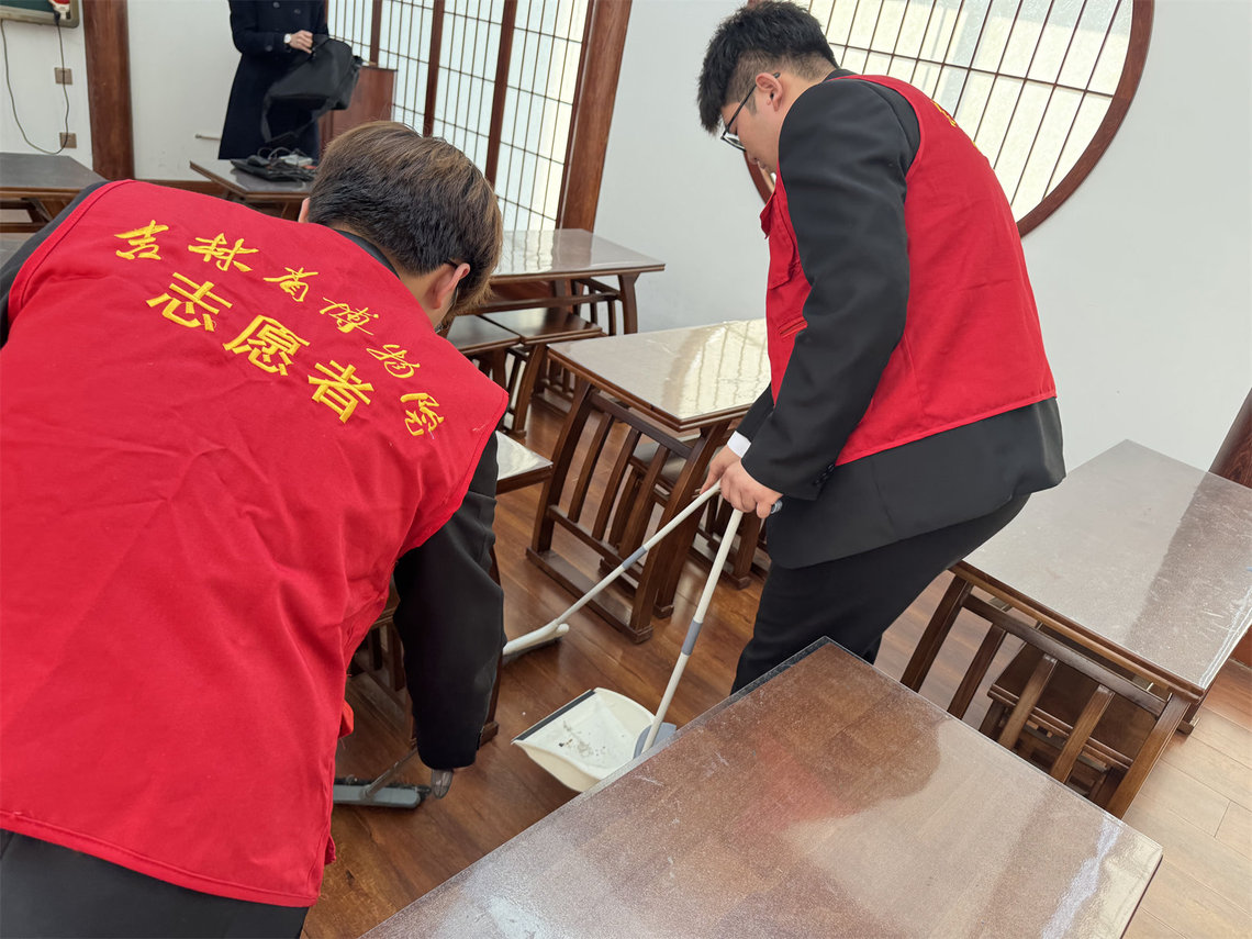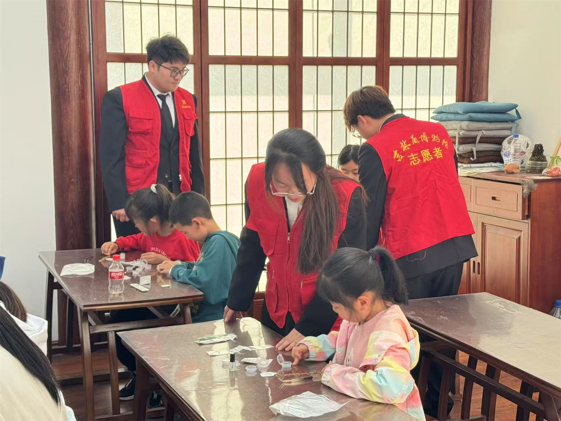 参观结束后,青马学员迅速转换身份,化身志愿者投身前台接待、社教辅助等工作。他们在前台耐心解答游客咨询、引导参观;在纪念册盖章处动作利落,为游客留存纪念印记;在社教活动区协助开展课程,手把手教小朋友绘画剪纸,现场氛围热烈温馨。活动尾声,学员们主动清扫场地,让展厅恢复整洁。