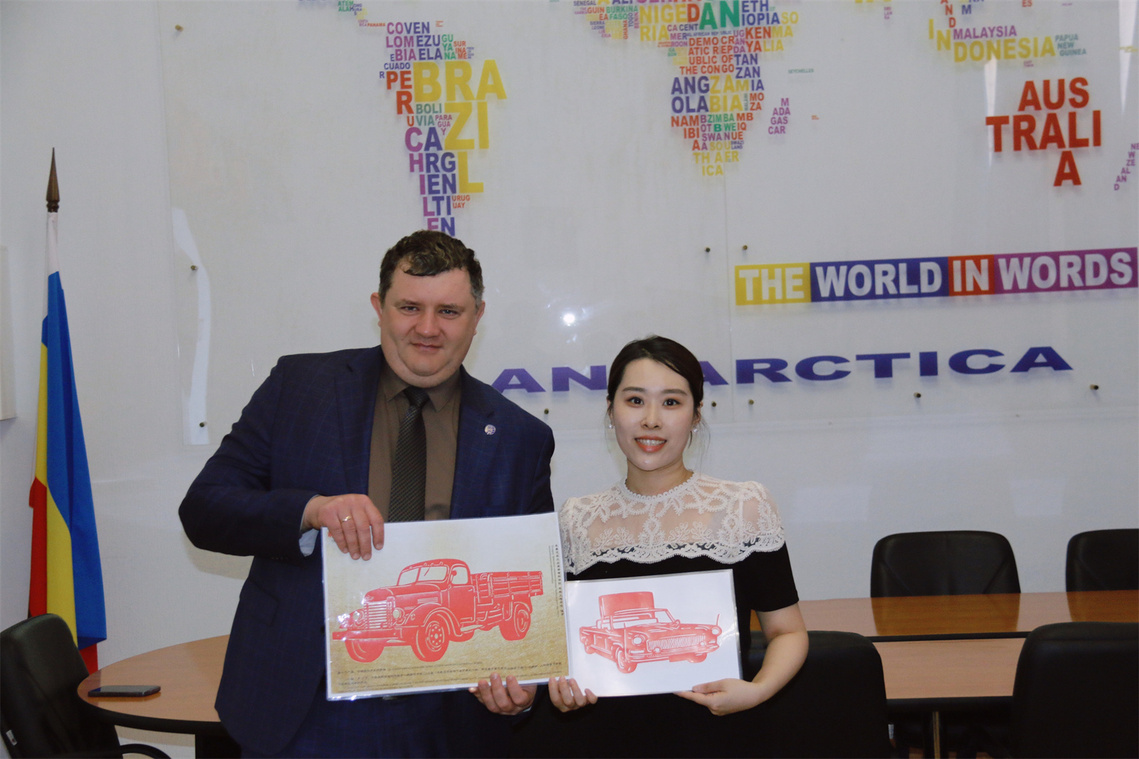 研学团与俄方交流中华传统文化及红旗汽车发展历史并赠送松辽剪纸作品