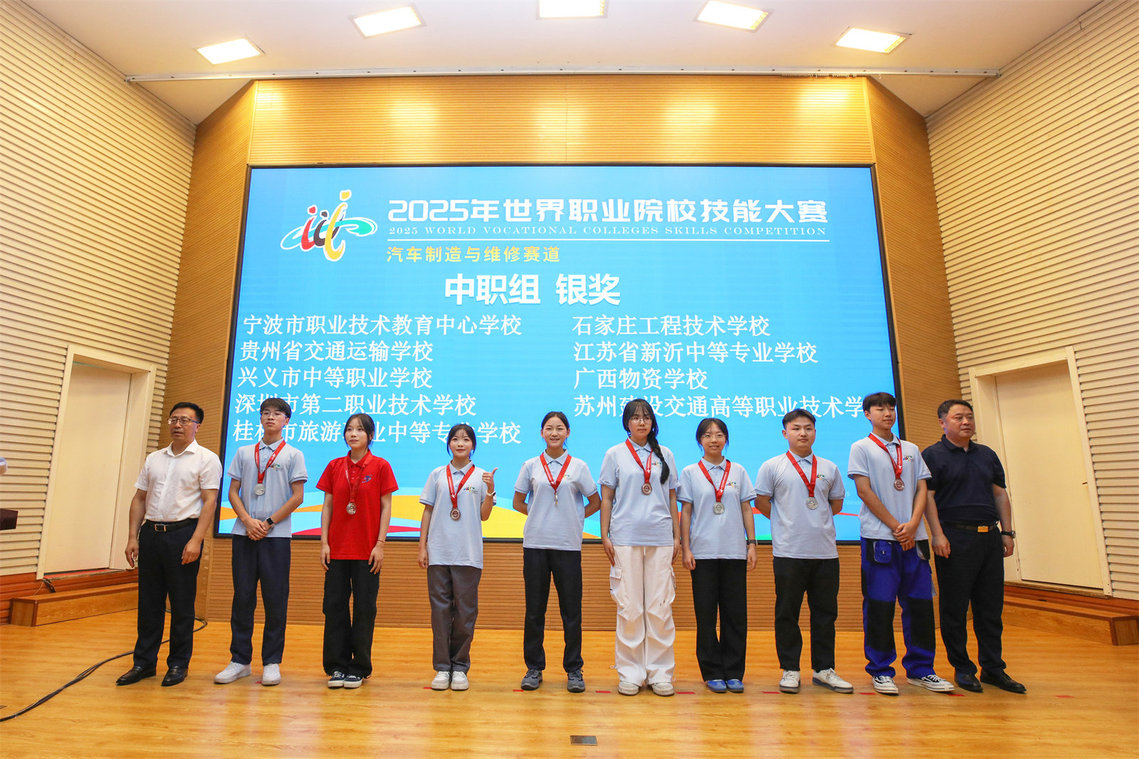长春市教育局副局长李亚君、吉林交通职业技术学院党委书记于繁华为中职组银奖获奖队伍颁发奖牌。