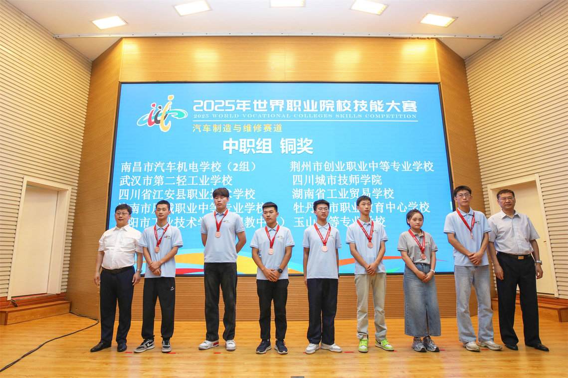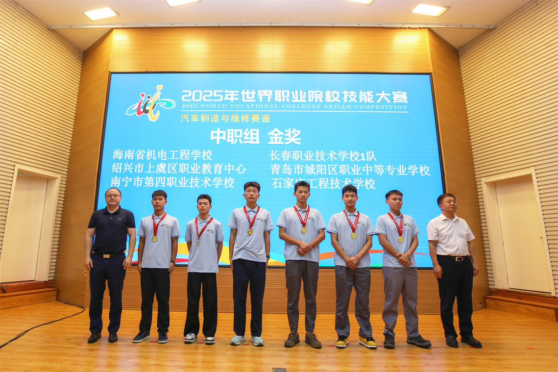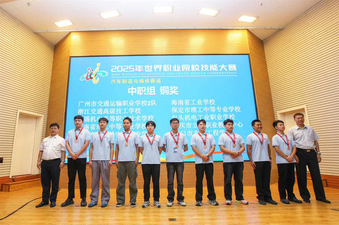 全国汽车职业教育教学指导委员会秘书长徐念峰、吉林省教育厅副厅长刘学军为中职组金奖获奖队伍颁发奖牌。